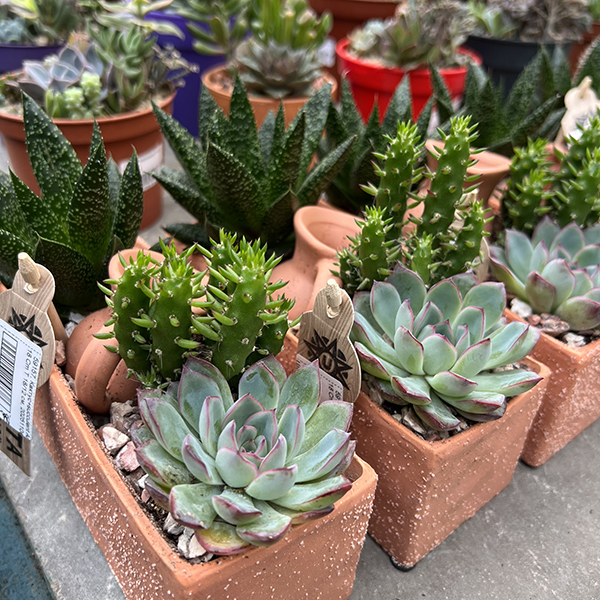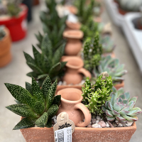 Композиция из нескольких видов суккулентов в керамическом горшке с декором.