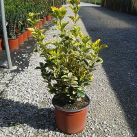 Бересклет японский - вечнозеленый кустарник с кожистыми темно-зелеными листьями, узко-эллиптической формы с мелкозубчатым краем, 3-8 см длиной. Цветки желтовато-зеленые до 1 см, собраны в соцветия зонтик по 10-30 шт. Плоды — розовые и оранжевые коробочки.