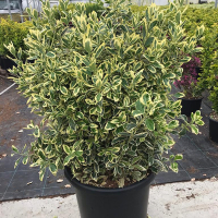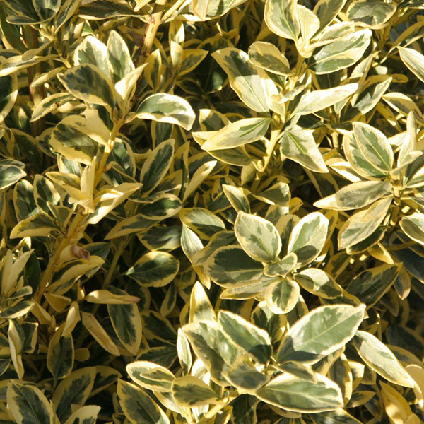 Euonymus japonicus Bravo - вечнозеленый декоративный кустарник с темно-зелеными глянцевыми листьями, которые имеют ярко-белую или кремовую кайму, создавая пестро-белый эффект.