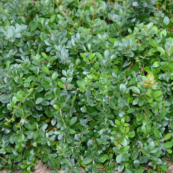 Листья: очерёднорасположенные, яйцевидные, длиной 1-2 см, тёмно-зелёные с красными краями, слегка кожистые, мягкой зимой не опадают.