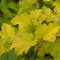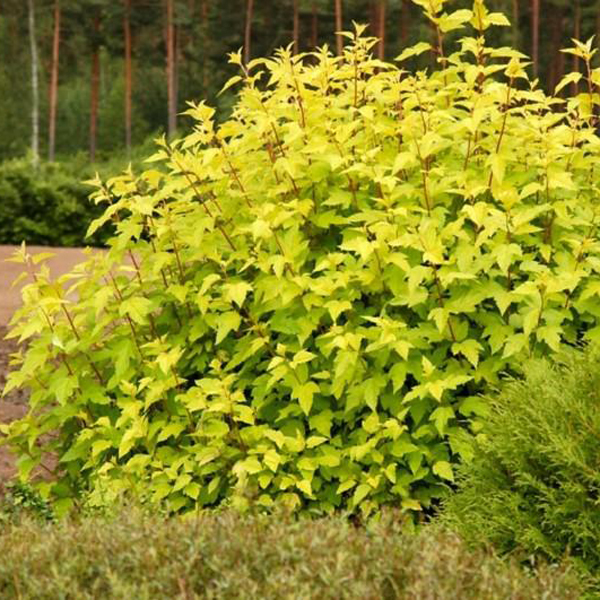 - кустарник высотой до 2-2,5 м с густой округлой кроной, образованной вертикальными, слегка раскидистыми ветвями. Побеги - красновато- или розовато- коричневые. Листья 3-5 лопастные, яркие, лимонно-желтые, в центре куста - желто-зеленые. Осенью - золотисто-желтые. Период цветения июнь-июль. Цветки бело-розовые, в щитковидных соцветиях. Плоды вздутые, бурые. Темп роста быстрый.