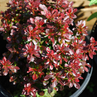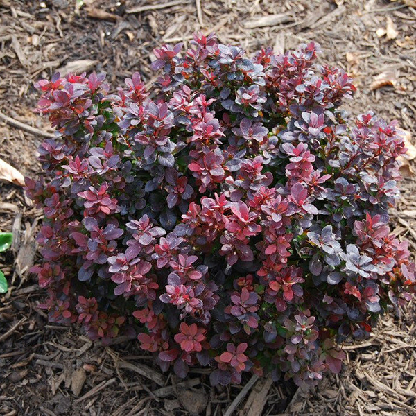 Барбарис Тунберга Багатель - медленнорастущий карликовый многоствольный кустарник шарообразной формы высотой 40 см, с оригинальным окрасом листьев в багряно-красный цвет с медным отливом, осенью становятся ярко-красными. В сравнении с другими декоративными формами барбарисов относительно медленнорастущее растение.