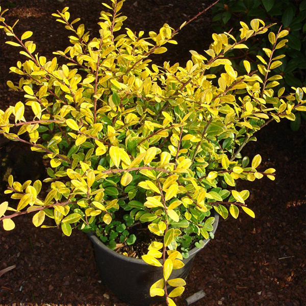 Вечнозеленый широко раскидистый, низкий небольшой кустарник, очень медленнорастущий, 0,6 – 0,8 м высотой, чуть больше в ширину. Листья расположены очередности, 1 – 2 см длиной, золотисто-желтые, позже зеленеют. Светолюбивый, выносит легкое затенение (интенсивность цвета наибольшая на солнце, в тени зеленеет). Слегка более чувствительный, чем зеленолистный, необходимо защищенное месторасположение, особенно защита от зимних сквозняков. Любит влажные, но не заболоченные места Морозостойкость 5а - 6 Из кустарника получаются великолепные и неприхотливые живые изгороди и бордюры.