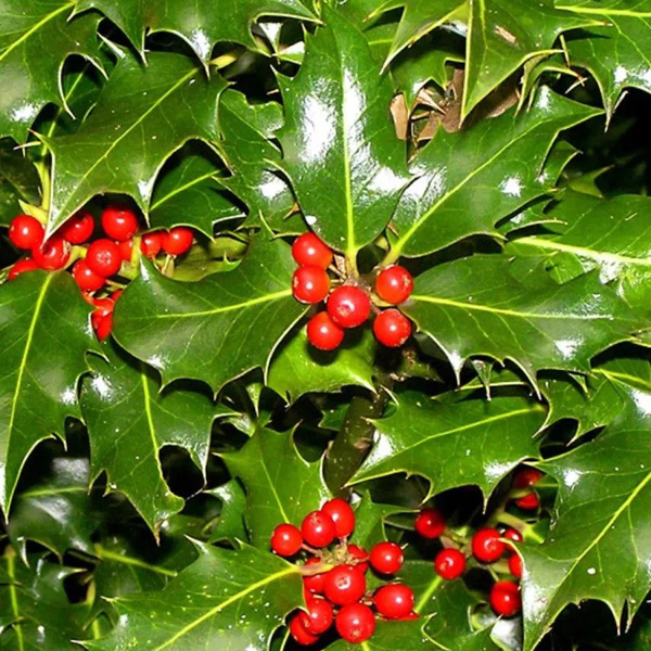 Падуб дуболистный (часто гибрид Ilex ? aquipernyi или сорта Ilex aquifolium) - декоративный вечнозеленый кустарник с кожистыми, колючими листьями, напоминающими дубовые. Ценится за яркие красные ягоды (осенью/зимой) и морозостойкость.