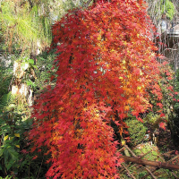 Декоративный сорт японского клена (Acer palmatum Ryusen), что означает "Дух Дракона", отличающийся уникальной плакучей кроной с ниспадающими побегами, которая напоминает каскад. Он имеет пальмовидные листья, которые весной ярко-зеленые, а осенью приобретают насыщенные желтые, оранжевые и красные оттенки. Клен предпочитает солнечные или полутенистые места с защитой от сильного ветра и прямых полуденных лучей, а также влажные, хорошо дренированные почвы.