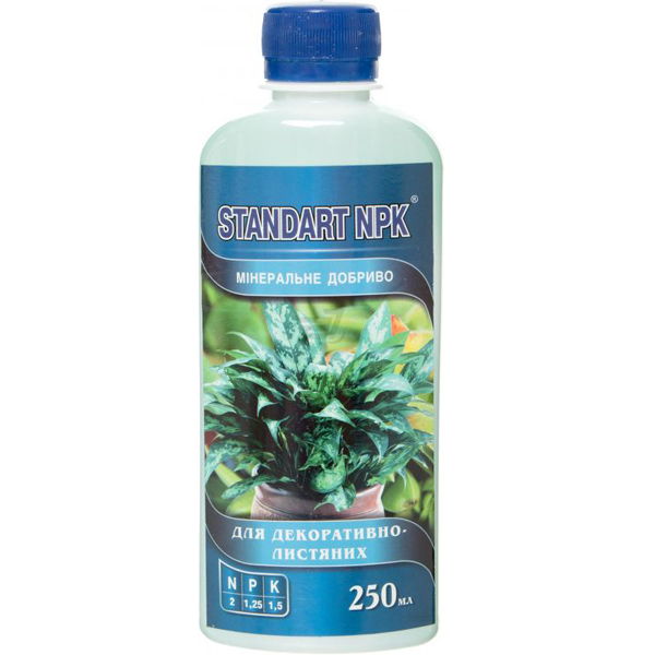 Удобрение минеральное Standart NPK для декоративно-лиственных растений - cпециально разработанное комплексное минеральное удобрение, обеспечивает максимальное проникновение необходимых питательных веществ и микроэлементов для растений. Объединяет самые необходимые питательные вещества для нормальной жизнедеятельности зеленных комнатных растений. Обеспечивает сбалансированное развитие растений, обильный лиственный покров. Регулярное использование удобрений способствует укреплению имунитета к заболеваниям.