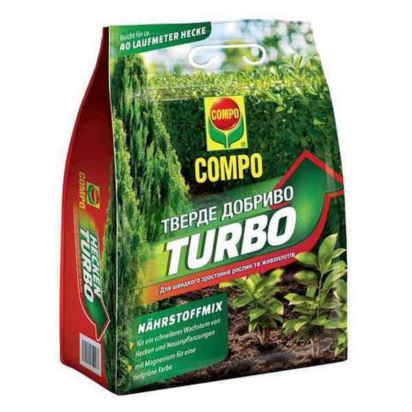 Твердое удобрение COMPO TURBO® – инновационный продукт, обеспечивающий мгновенный эффект быстрого роста для вашего сада, насаждений и имеющихся живых изгородей. Благодаря уникальной формуле, разработанной на основе передовых научных исследований, твердое удобрение COMPO TURBO® предоставляет вашим растениям все необходимые питательные вещества для интенсивного роста и развития. Это быстродействующее удобрение имеет мгновенный эффект, что позволяет видеть результаты уже через несколько дней после применения. Особенности Быстрый немедленный эффект. Быстрая защита для сада. С магнием для глубокого зеленого цвета листьев. Высокий диапазон для полного покрытия всей растительности. Обеспечивает турбо рост новых насаждений и имеющихся живых изгородей.