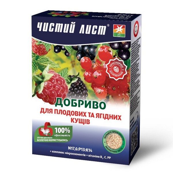 Чистый лист для плодовых и ягодных – обеспечивает растение полноценным питанием, компенсирует дефицит макро и микроэлементов, повышает сопротивляемость болезням, гнилам и переохлаждению.