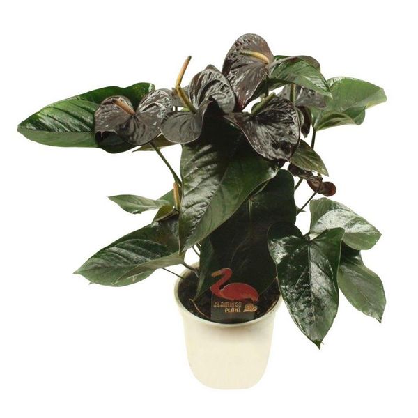 Антуриум Джамбо Блек — это эффектный сорт, ценимый за крупные, овальные, глянцевые листья глубоких оттенков от темно-зеленого до черного, а также за крупные, восковидные, почти черные цветы , придающие растению пышный и изысканный вид.