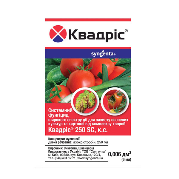 Фунгицид Квадрис - системный препарат широкого спектра действия для защиты томатов, огурцов, винограда, картофеля и др. от комплекса болезней. Способствует повышению урожайности и улучшает качество продукции, оказывает лечебно-профилактическое действие при борьбе с различными заболеваниями подавляющего большинства сельскохозяйственных культур.