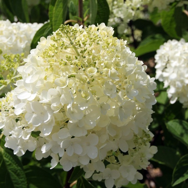 Гортензия метельчатая Сильвер Доллар - декоративна крупными, плотными, широкопирамидальными белоснежными соцветиями из стерильных цветков, слегка розовеющих к осени.