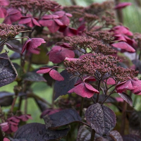 Гортензия пильчатая Daredevil (Hydrangea serrata Daredevil) - плотный, компактный кустарник округлой формы, раскидистый, высота растения 50-60 см, листья яйцевидно-ланцетные, зубчатые, сначала темно-зеленые, затем шоколадного и пурпурного цвета в конце лета.