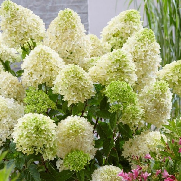 Внешний вид: Высота взрослого растения достигает 120 см, диаметр кроны – 70 см. Побеги прямостоячие, покрытые насыщенно-зеленой листвой конической формы. Во время цветения под тяжестью соцветий могут сгибаться, поэтому нуждаются в опоре. Этот сорт гортензий отличается от других крупными лепестками цветов, а размером соцветия больше похожи на сирень или гиацинт. Высота соцветия 30 см, диаметр – 20 см. В июле цветки зеленовато-белые, к сентябрю приобретают розовый оттенок.