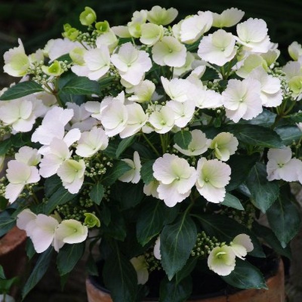 Создает изобилие белых цветов в кружевной шапке, окрашенных в бледно-розовый цвет.