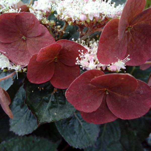 Гортензия пильчатая Daredevil (Hydrangea serrata Daredevil) - плотный, компактный кустарник округлой формы, раскидистый, высота растения 50-60 см, листья яйцевидно-ланцетные, зубчатые, сначала темно-зеленые, затем шоколадного и пурпурного цвета в конце лета.