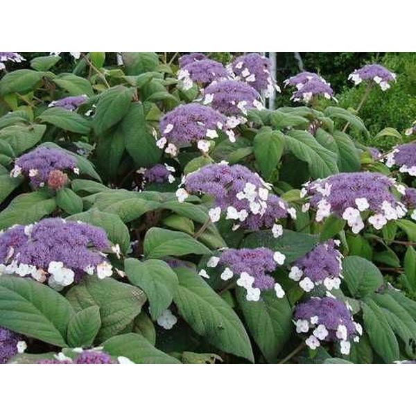 Гортензия шершавая - украсит Ваш садовый участок благодаря своим декоративным свойствам. Листопадный кустарник высотоай 2 -3,5 м. Ветви красно-коричневые, толстые. Листья крупные, ланцетные, 35 см длиной, верхняя сторона шершавая, нижняя покрыта густым белым пушком, темно-зеленые в начале сезона, к концу сезона цвет листвы меняется на коричнево-оранжевую. Цветение длительное с июля по сентябрь на побегах текущего года. В центре соцветия сине-лиловые, окружены белыми цветками. Соцветия плоские, диаметром 20 см.