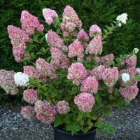 Гортензия метельчатая Сандей Фрейз - прекрасный обильноцветущий сорт образующий прямостоящий, очень компактный, густой и ровный куст до 1,5 м в высоту. Зацветает широкопирамидальными соцветиями изначально белого цвета, позже, розовеют.пломбира. Достигает около 1-1,5м в высоту.