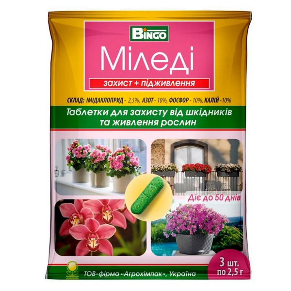 Миледи представляет собой контактно-системный инсектицид в таблетках, который также служит минеральной подкормкой для комнатных декоративных растений в закрытых почвах, предоставляя им защиту от листогрызущих и сосучих насекомых вредителей. Главный активный компонент данного средства – имидаклоприд, который, при контакте с насекомыми, нарушает работу центральной нервной системы, вызывая паралич и последующую гибель. Помимо защитного действия таблетка содержит удобрение с питательными компонентами азота (N), фосфора (P) и калия (K) в равных пропорциях. Данное удобрение укрепляет иммунитет растений и обеспечивает их необходимыми питательными веществами для их здорового роста и развития. С таким питательным комплексом растение лучше переносит действие химических веществ без риска фитотоксического эффекта. Универсальная таблетка Миледи включает в себя качества инсектицидного препарата и удобрения, обеспечивая надлежащую комплексную минеральную подкормку комнатных растений, а также их защиту от белокрылки, щитовки, червеца, клопа, цикадки, трипса, тли, моли, блешки, скосара, паутинного клеща. и других вредителей.