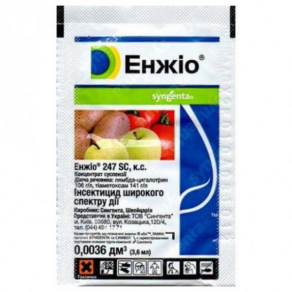 Энжио 247 SC к.с. - новый системно-контактный, чрезвычайно мощный инсектицид для защиты плодовых, овощных культур и картофеля от вредителей, который состоит из двух действующих веществ. Препарат характеризуется широким спектром действия на многих вредителей, а также на взрослые стадии развития клещей. В отличие от других инсектицидов эффективно действует при повышенных и пониженных температурах и засушливых условиях окружающей среды. Срок защиты растений от вредителей при обработке препаратом Энжио 247 SC к.с. составляет более 20 дней. Контактное вещество, входящее в состав препарата проникает через оболочку вредителей и приводит к их уничтожению, системное вещество поступает в растение, где скапливается в точках роста и обеспечивает длительную защиту всего растения, а также его новых побегов. Благодаря высокой растворимости препарата, при попадании в грунт, он всасывается корневой системой растения и тем самым обеспечивает дополнительный эффект - защиту от грунтовых вредителей.