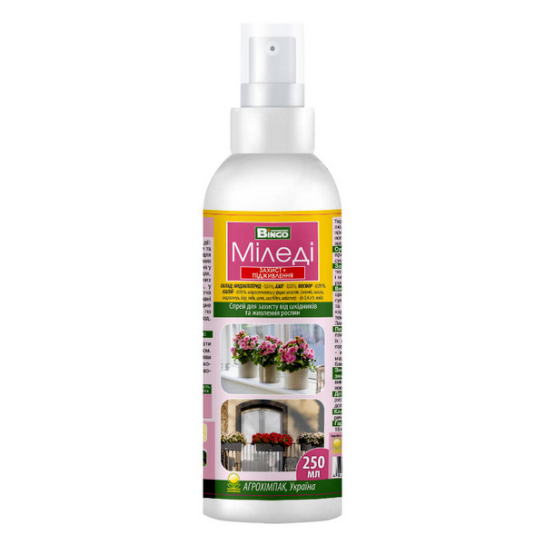 Миледи спрей – препарат двойного действия: контактно-системный спрей для борьбы с листогрызущими и сосущими вредителями и удобрение для подкормки декоративных и комнатных растений. Купить Миледи спрей от вредителей для комнатных растений можно в нашем интернет магазине Гарден Клаб с бесплатной доставкой и по лучшей цене.