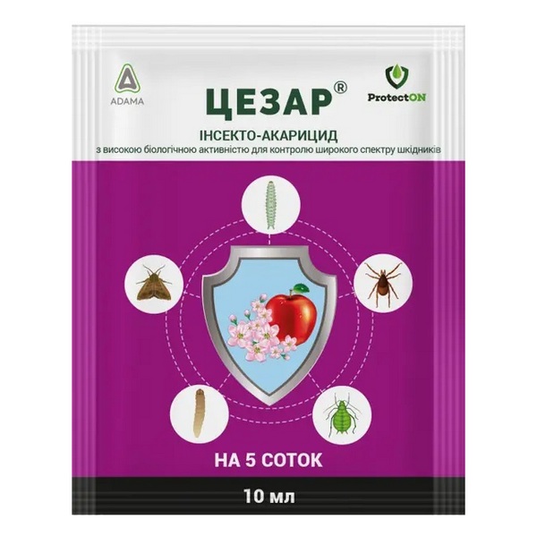 Цезарь к.э. 10 мл (ProtectON) – это инсектоакарицид с высокой биологической активностью для борьбы с широким спектром вредителей растений, в том числе против всех подвижных стадий клещей. Инсектицид Цезарь оказывает контактно-желудочное действие и парализует нервную систему вредителей, что в течение нескольких минут приводит к дезориентации, прекращению питания, параличу и смерти насекомых (нокдаун-эффект).