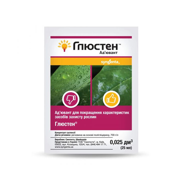 Глюстен – это препарат - прилипатель и адъювант природного происхождения, полностью безопасный для полезной энтомофауны. Он способен улучшать работу действующего вещества основного препарата при нормальных и неблагоприятных условиях и обеспечивает надежное содержание рабочего раствора на поверхности растений без риска стекания. Кроме того, Глюстен уменьшает риски фитотоксичности препаратов.