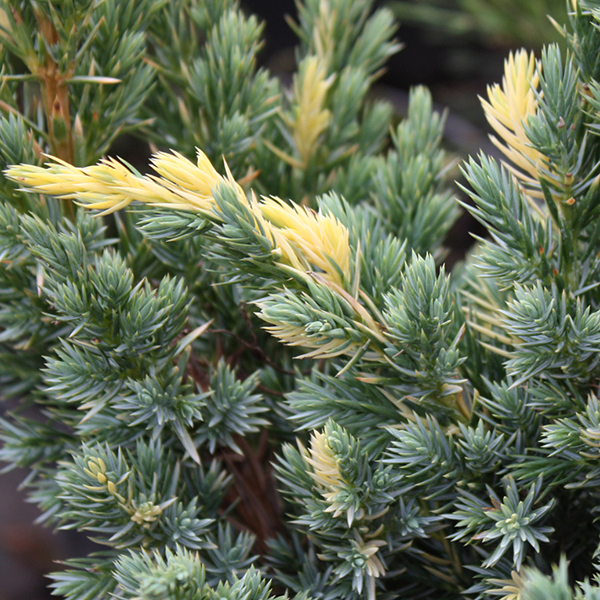 Можжевельник Голден Флейм оригинальный хвойный кустарник - обладатель двухцветной хвои. Форма кроны - широкораскидистая, главные побеги косо расположены и направлены вверх, молодые приросты на концах побегов немного свисают. Высоты достигает 1 м. Хвоя игольчатая, серебристо-голубого цвета, с нерегулярно разбросанными кремово-желтыми пятнами.