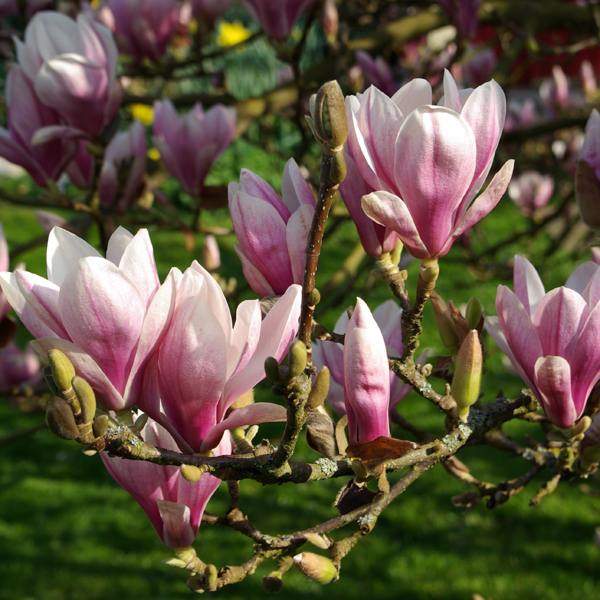Магнолия суланжа (Magnolia soulangeana) - гибрид, полученный путем опыления магнолии обнаженной и лилиецветной. Это 6-8-метровое дерево с рыхлой кроной, обычно начинающее ветвиться близко от земли. Листья обратнояйцевидные или овальные, заостренные на вершине и у основания, длиной 13-22 см, матово-зеленые, сверху гладкие, снизу опушенные.