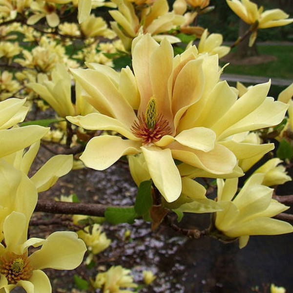 Баттерфляй - одна из представительниц древнейшего рода Магнолий. Это лиственный кустарник, со светло-коричневым стволом, расцветая в середине весны, наполняет нежным лимонным ароматом весенний воздух. Вертикальные разветвлённые ветви создают широкую пирамидальную форму. В апреле магнолия покрывается множеством, сочно-желтых бутонов. Позже бутоны раскрываются, и дерево становится желтовато-зеленоватым от лепестковых, чашевидных цветов, с красноватыми тычинками. Появляются они на концах ветвей и направлены вверх. Чаша цветка имеет ширину около 9 см. После цветения появляются большие и блестящие, эллиптической формы, со слегка волнистыми краями листья. Они темно-зеленого цвета, длиной 6-9 см и шириной 5 см. Осенью листва становится медно-бронзового цвета. Темп роста средний.