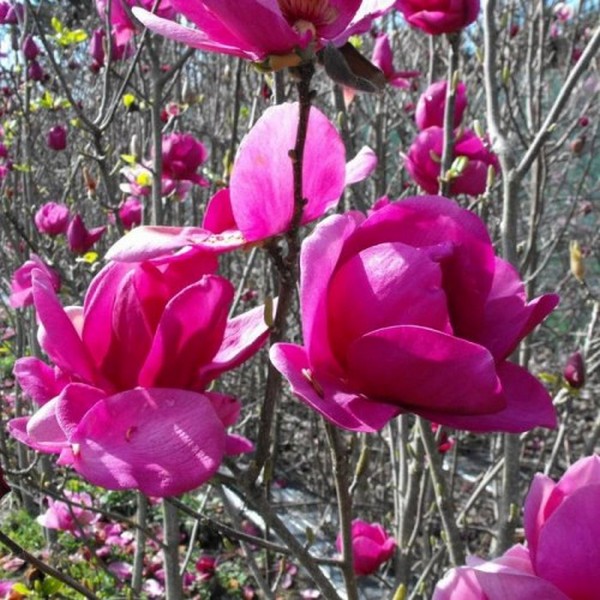 Магнолия гибридная Cleopatra – замечательный сорт получен новозеландскими селекционерами в результате скрещивания магнолии Суланжа Sweet Simplicity и сорта магнолии Black Tulip. Дерево стройное высотой до 4 м с плотной конической кроной шириной около 2 м. Таких размеров растение достигает в возрасте более 10 лет. Листья среднего размера, обратнояйцевидные, темно-зеленые. Цветки необычайно красивы, они крупные, диаметром до 20 см, удивительного цвета, который условно можно назвать аметистовым (сочетание фиолетового и красного с голубым оттенком). Цветки имеют форму тюльпана, состоят из 6 - 12 лепестков, в полном роспуске напоминают цветок лотоса. Цветки обладают сильным ароматом. Цветет магнолия очень обильно в конце апреля – мае, в августе возможно повторное цветение. Для выращивания магнолии потребуются богатые, хорошо дренированные слабокислые почвы (рН 5 – 6). При посадке важно выбрать подходящее место, оно должно быть солнечным и защищенным от северных и восточных ветров. Лучше всего посадить невдалеке от южной стены дома. Хороший микроклимат – залог успеха при выращивании этой нежной красавицы. Морозоустойчивость: зона USDA 6. Молодые растения нуждаются в укрытии на зиму, в дальнейшем зимостойкость повышается.
