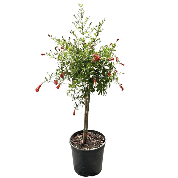 Куст или дерево граната вырастает до 60-100 см высотой. В плодоношение вступает на 2 год. Цветение начинается в мае. Небольшое растение в период цветения с мая по сентябрь усыпано крупными пурпурными цветами. Многочисленные трубчатые красные или оранжевые цветки по большей части одиночные, образуются в первый же год выращивания на концах сильных побегов. Цветки по размеру больше листочков, достигают 4 см в диаметре.