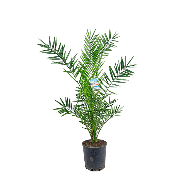 Финик канарский вырастает до 2 м в высоту. Перистые ваи (до 3-5 м) сизо-зеленого цвета разделены на листочки по обе стороны средней жилки. Листочки жесткие, прямые и узкие. Черешки покрыты игловидными шипами. Ваи слегка отогнуты наружу.