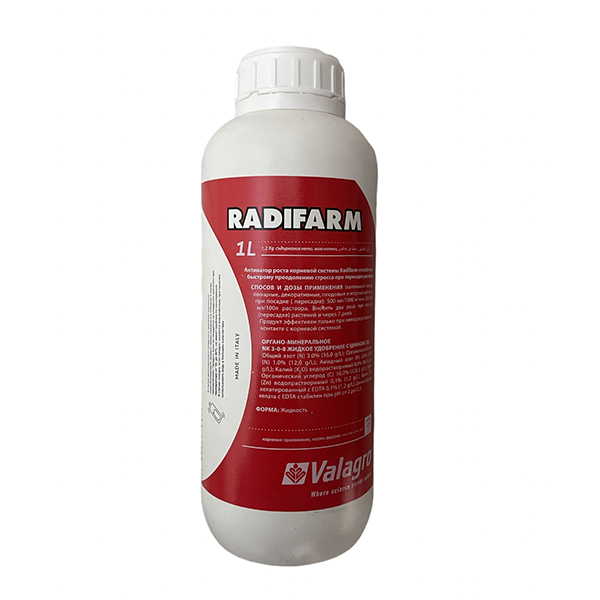 Биостимулятор Радифарм (Radifarm) - органическое удобрение с витаминами и микроэлементами в форме хелатов. Специально разработанный активатор для развития корневой системы. Стимулирует развитие боковых и вспомогательных корней. Обеспечивает более ранний старт вегетативного цикла, стимулирует выработку гормонов, отвечающие за рост корня. Уменьшает стресс, вызванный пересадкой растения. Способствует быстрому укоренению рассады, а также саженцев, кустов, деревьев. Защищает от заморозков.