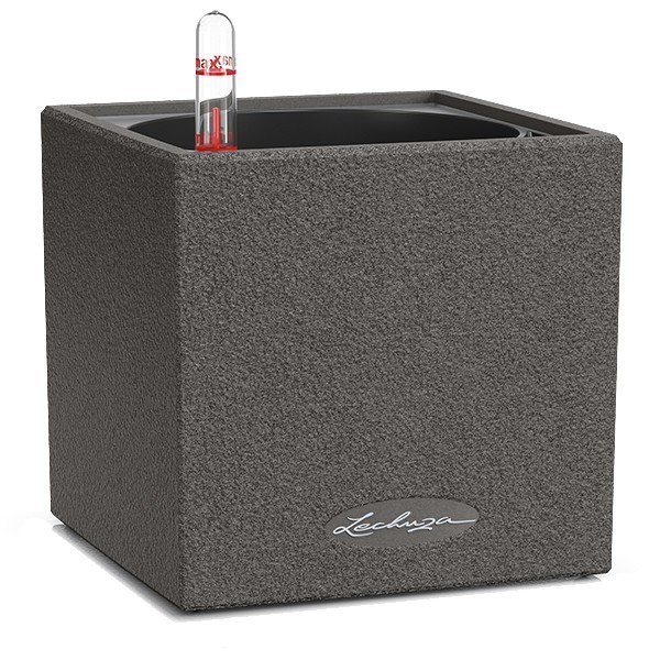 Вазон Lechuza Canto Stone с системой автополива состоит из внешнего кашпо, съемного посадочного горшка, дренажа и шахты для залива воды с индикатором уровня.