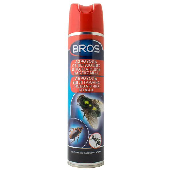 Аэрозоль от летающих и ползающих Bros 150 мл – уникальное средство, которое надолго защитит вас от насекомых. Преимуществом данного средства является его эффективность в борьбе как с ползающими, так и с летающими насекомыми, которые чувствительны к воздействию компонентов препарата. Аэрозоль проявляет мгновенное действие с долгосрочным закреплением полученного эффекта. С инсектицидом вам будут не страшны ни мухи, ни комары, а также: осы, моль, тараканы, блохи, муравьи и др. Перед применением следует ознакомиться с инструкцией к препарату. Перед отделкой помещения закрыть двери и окна, взболтать баллончик и распылить в помещении от края комнаты, двигаясь к двери. После дезинсекции оставить помещение закрытым еще примерно на 15 минут, затем проветрить. Препарат хранить в недоступном для детей месте.