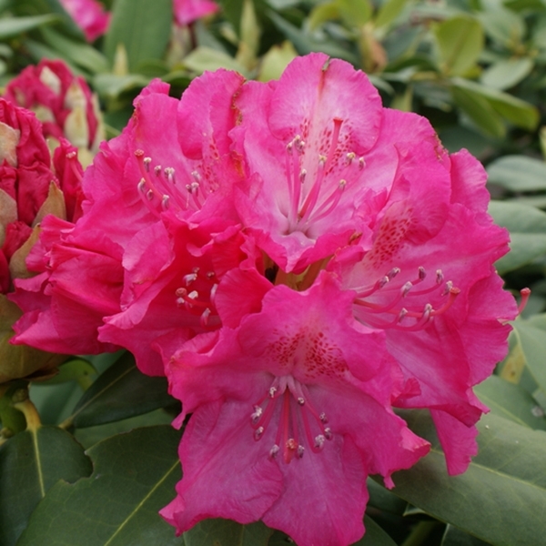 Рододендрон гибридный Германия (Rhododendron hybrida Germania) - вечнозеленый рододендрон с аккуратной округлой кроной. В высоту достигает 2,0 – 2,5 м, разрастаясь в диаметре до 3,0 м. Листья вечнозеленые, при распускании светло-зеленые, позже сверху темно-зеленые, кожистые, снизу более светлые. Цветение обильное, с конца мая в течение 3х недель. Цветки розовые, воронковидные, собраны в шаровидные соцветия из 10-15 цветков. Сорт довольно морозостойкий.Выдерживает прямые солнечные лучи, но лучше высаживать на затененном месте. Почва требуется рыхлая, с высоким содержанием гумуса. Влаголюбивый.