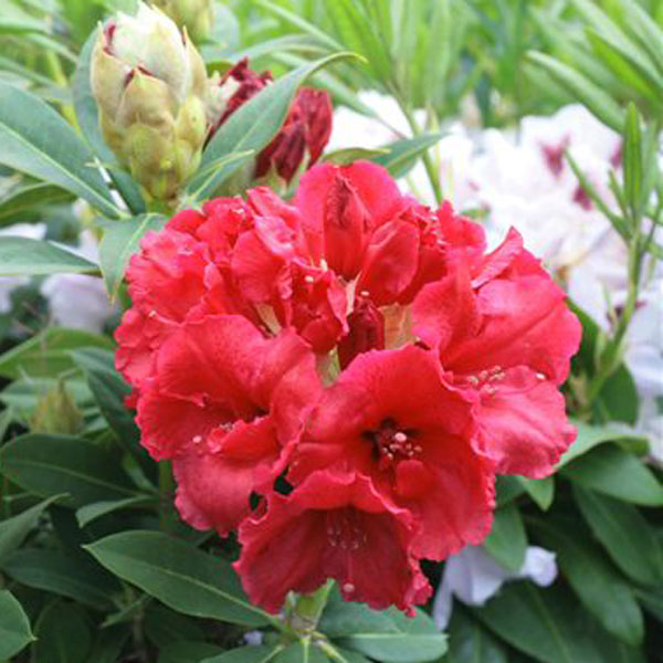 - рододендрон с большими воронкообразными ярко-красными цветами. Вечнозеленые листья овальные, кожистые, темно-зеленые летом и бронзовые зимой. Взрослый кустарник достигает около 2 - 2,5 м в высоту и ширину.