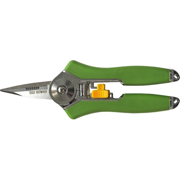 Ножницы с маленькими лезвиями ("микронаконечниками") - идеальны для работы с цветами, комнатными растениями, цветочными композициями, садовой земляникой, подрезки зелени и винограда. Идеальный инструмент для работы с хвойными кустарниками, где требуется точность. Особенность инструмента - хорошо продуманная и мягкая ручка с нескользящими ручками TPR для безопасной и комфортной работы при длительном использовании. Простая и безопасная система блокировки. Отличный сектор для мелкой и труднодоступной обрезки, острый и удобный.