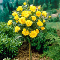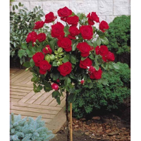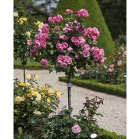 Штамбовая роза всегда и везде бросается в глаза, а живет от 7-ми до 10-ти лет. Она будет цвести дольше, чем обычная роза. Штамбовая роза может быть использована как центральный элемент композиции в вашем саду. По этому, выбирая её, необходимо помнить, что это фокусное растение. Важно сразу подумать, как она будет выглядеть в течение сезона и что будет расти под ней. Так же штамбовая роза может быть использована для создания живых изгородей или арок.