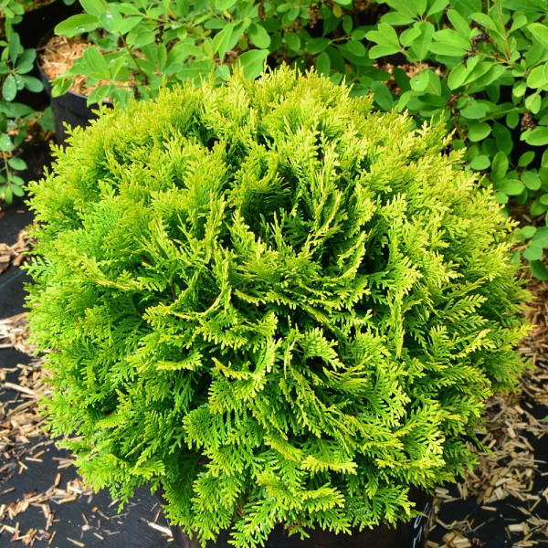 Туя западная Мириам - шаровидная туя желто-зелёного цвета, с вертикально расположенной хвоей, которая меняет окраску на бронзовый зимой, а весной снова становится сочно-зелёной с желтыми оттенками. Сорт выведен из Thuja occidentalis Danica, переняв от неё лучшие декоративные свойства. Хорошо растёт в черте города, подходит для выращивания на всей территории Украины.