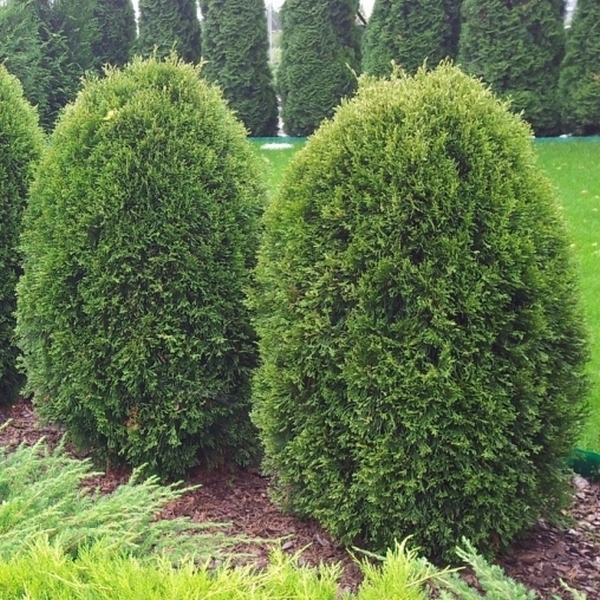 Туя западная ‘Ховея’ (Thuja occidentalis Hoveyi) – хвойный вечнозеленый кустарник яйцевидной формы. Крона плотная с прямыми побегами достигает 1,5 м. в высоту. Годовой прирост 8-12 см. Листва светло-зеленого цвета чешуйчатая. Зимой хвоя приобретает коричневатый оттенок. С возрастом крона разваливается и становится шарообразной. Thuja occidentalis Hoveyi – очень декоративный вид. Характерная яйцевидная форма весьма ценится при создании ландшафтных композиций. Европейские ландшафтные дизайнеры и садоводы уже давно взяли на заметку оригинальную форму туи и широко используют этот сорт при формировании панорамных парков и маленьких приусадебных садов.