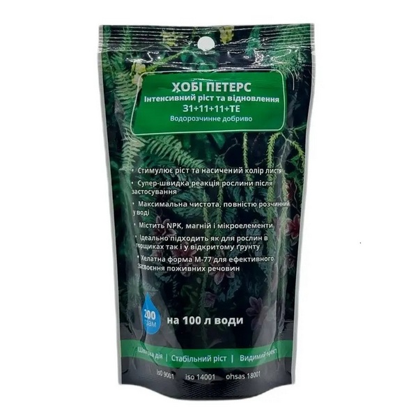 Минеральное удобрение Хобби Петерс 31-11-11+TE водорастворимое, 200 г (Peters) предназначено для стимулирования интенсивного роста и восстановления растений. Его сбалансированная формула способствует укреплению зеленой массы и улучшает состояние растений.