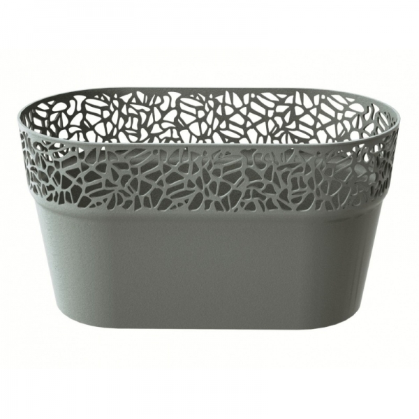 Горшок овальной формы станет прекрасным местом для выращивания рассады, суккулентов, комнатных цветов. Серый окрас эффектно оттенит зелень и цветение, которое будет казаться еще ярче. Верхняя часть вазона напоминает кружево, а сам материал легко моется и не выгорает на солнце.