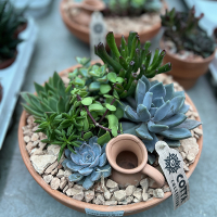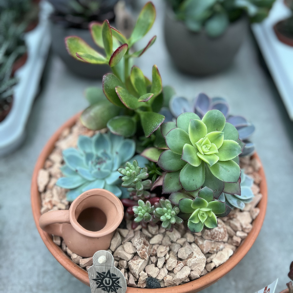 Композиція з кількох видів сукулентів у керамічному горщику з декором. Варіанти в асортименті уточнюйте у консультантів.