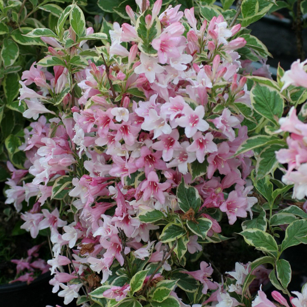 Вейгела квітуча Варієгата (Weigela florida Variegata) - компактний, густий чагарник з округлою формою. Досягне висоти 1,5 м і близько 2 м в діаметрі. Квіти: Красиві великі, трубчасто-дзвонові, від біло-рожевого до рожево-лілового відтінку. Час цвітіння: зацвітає в кінці травня - початку липня, цвіте рясно, довго, може повторювати цвітіння протягом усього сезону. Листя: короткочересті, майже сидячі, еліптичні, із загостреною вершиною, зазубрені по краях, знизу злегка опушені. Дуже декоративні своїм строкатим яскраво-зеленим забарвленням з біло-кремовою облямівкою. Місцерозташування та грунт: Віддає перевагу сонячним і напівтінистим місцям. У тіні менше цвіте. Виносить всі садові ґрунти, віддає перевагу вологим, багатим і добре дренованим ґрунтам, від кислих до слабо лужних. Використання: Вейгела квітуча Нана підходить для одиночних та групових посадок, бордюрів, контрастних колористичних композицій. Рекомендується для посадок на садових ділянках, парках, міському озелененні.