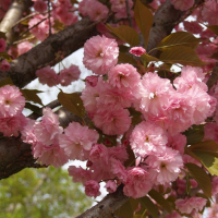 Сакура Канзан (Kanzan, декоративна слива, японська вишня) – це неймовірно красиве декоративне дерево. Цей сорт японської вишні є невисоким (виростає до 12 метрів), має сильну крону з великою кількістю суцвіть у період цвітіння. Цвітіння сакури продовжується 2 тижні, після зав'язуються плоди. Вишеньки (лили сливи) є темно-сині, майже чорні, або фіолетові горошини, гірко-кислі на смак. Особливості сорту: Сакура Канзан – чарівне дерево невисокого зросту. Відмінно почувається в місті, може рости на суглинках або ґрунтових сумішах. Має приємний гладкий ствол світло-коричневого кольору. З віком кора стає темнішою і покривається елегантними тріщинами. Характеристики плода: Темні, практично чорні ягоди, непридатні для вживання. Період дозрівання: Середина весни. Урожайність: Низька, плоди не використовуються в харчових цілях. Форма крони: Перевернутий конус. Молоді гілки звисають над землею, основні паралельні стовбуру, спрямовані у небо. Рекомендації з посадки та догляду: Сакура Канзан - це дуже теплолюбна рослина, її варто купити, якщо ділянка південного або південно-східного розташування. Дерево погано переносить різкі перепади температури та протяги, тому місце має бути добре освітленим, на височині. Лунка повинна трохи перевищувати розміри кореневої системи, для засипання коренів використовується суміш із верхового торфу, перегною та піску. У ямі обов'язково облаштовується дренаж. Догляд за сакурою Канзан дуже своєрідний. З настанням перших холодів стовбур потрібно огортати мішковиною, а ґрунт навколо дерева мульчити. Удобрюється декоративна злива двічі на рік: перед рухом соку і після цвітіння.