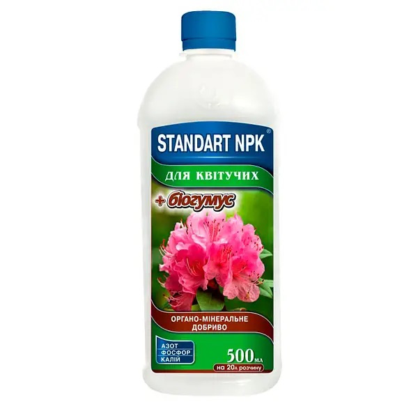 Концентроване рідке добриво Standart NPK, збагачене біогумусом та мінералами в хелатній формі, використовується для підживлення квітучих рослин з метою збагачення рослин необхідними мінералами та елементами для їх активного та здорового росту, а також для покращення декоративних властивостей. До складу даного живильного коктейлю включені азот (N), фосфор (P2O5), калій (K2O), магній (Mg), мікроелементи, гумінові сполуки та вітаміни. Дане добриво значно покращує якість ґрунту, оскільки його біогумус у п'ять разів перевищує властивості компосту. Мікроелементи та вітаміни зміцнюють захисні функції квітів, забезпечуючи їх велике та тривале цвітіння. Органомінеральне підживлення зміцнює імунітет рослин і робить їх стійкішими до різних стресових ситуацій, на кшталт недостатнього освітлення, екстремальних температур, протягів або незбалансованого поливу. За рахунок мінерального живлення, квітки рослин стають яскравішими, їх цвітіння стає довгим і насиченим. Правильне живлення також стимулює бутонізацію, допомагаючи прокинутися сплячим брунькам. Органо-мінеральне добриво Standart NPK застосовують для підживлення сурфінії, троянд, гібіскусу, петунії, азалії, бегонії, гвоздики, гербери, гладіолусів, нарцисів, хризантеми та інших.