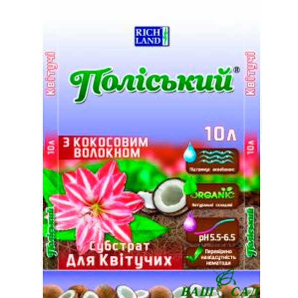 Субстрат "Поліський" - готова до використання органічна основа, виготовлена з верхового торфу та високоякісного кокосового волокна, сапоніту та митого річкового піску. Збалансована формула субстрату з кокосовим волокном стабілізує ґрунт, підвищує аерацію кореневої системи рослини, дозволяє адсорбувати надлишки вологи та при зневодненні вирівнює її баланс у субстраті, підвищує необхідну мікрофлору рослини, забезпечує пишність та барвистість квітів при цвітінні рослини. Призначений для вирощування декоративно-квітучих рослин у відкритих та закритих ґрунтах (за винятком орхідей, кактусів та вимогливих до зниженої кислотності таких як: азалія, рододендрони, вересові тощо). Об'єм: 10л.