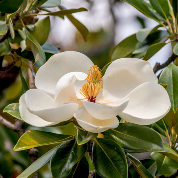 Магнолія великоквіткова - вічнозелене дерево з великими квітками, "королева" сімейства магнолієвих. На батьківщині, у південно-східних штатах США, вона росте у змішаних лісах із дубами, в'язами та іншими видами магнолій. У культурі досягає висоти 30 метрів, при цьому біля основи ствол буває до 1,5 м в діаметрі. Велике, блискуче, шкірясте листя зібране на кінцях гілок у вигляді "парасольки". Але особливо красиві дерева в період цвітіння – з червня по вересень.