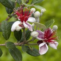 Фейхоа також відома під назвою Фейхоа Селлова і відноситься до сімейства миртових. Фейхоа може рости чагарником або у вигляді дерева з розлогою щільною кроною. Квітне фейхоа в травні-червні на пагонах поточного року. Декоративні білі з рожевим квіти контрастно відтінені яскраво-червоними тичинками, зібраними в пучок.